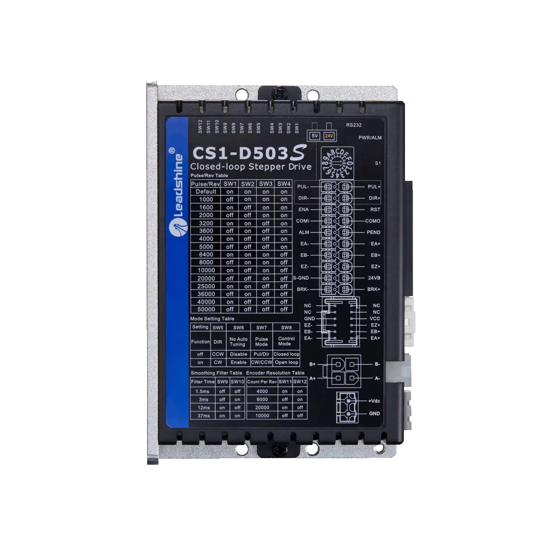 Leadshine CS1-D503S is closed loop stepper drive designed to solve loss of step problem in open loop stepper control systems, thus increase system reliability at minimal cost increase. It implements an advanced control algorithm of based on Leadshines tens of years’ experience in stepper and servo controls. The CS1-D503S is highly reliable, affordable and has excellent performance in many industrial applications such as CNC, medical, electronics, packaging…